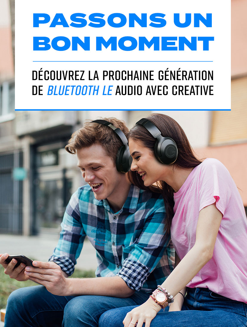 Chez Creative, nous souhaitons que vous profitiez d'une meilleure qualité sonore et d'une autonomie de batterie encore plus longue avec nos casques, enceintes et écouteurs true wireless pris en charge. En intégrant de manière transparente la technologie Bluetooth LE Audio dans notre prochaine gamme de produits, une expérience audio sans fil inégalée vous attend.