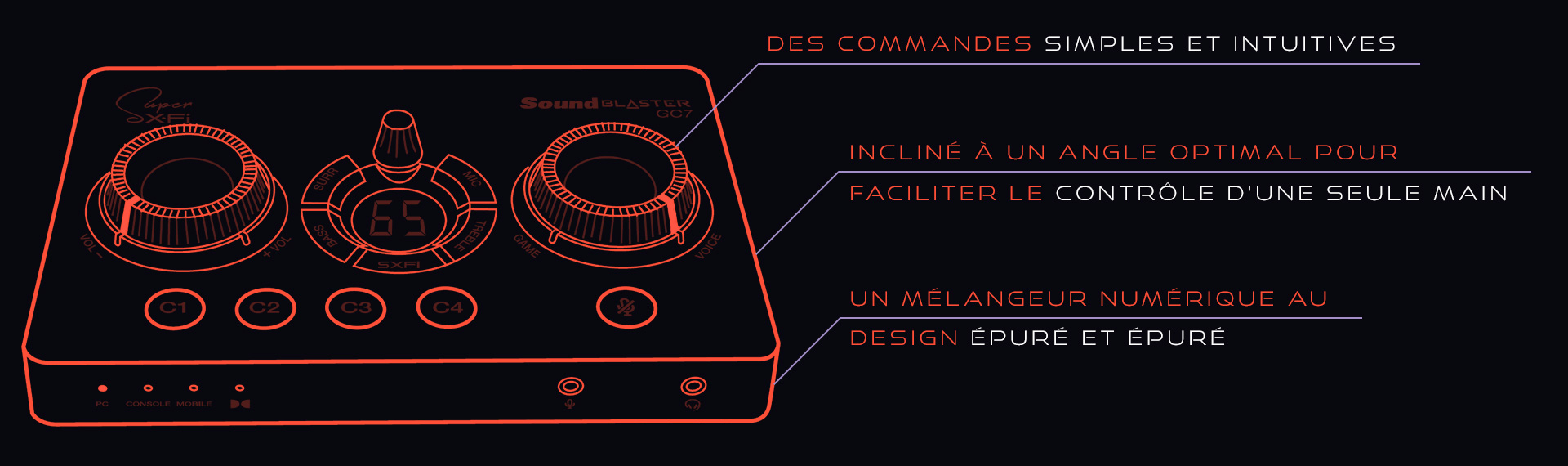Le meilleur gameplay implique des commandes intuitives qui permettent de prendre des décisions en une fraction de seconde pendant le jeu. Premier de sa série de solutions audio de jeu haut de gamme destinées aux joueurs expérimentés, le Sound Blaster GC7 vous propose la formule gagnante pour conquérir n'importe quel jeu : l'accès à une pléthore de commandes programmables directement intégrées à l'appareil pour des changements rapides lors du jeu.