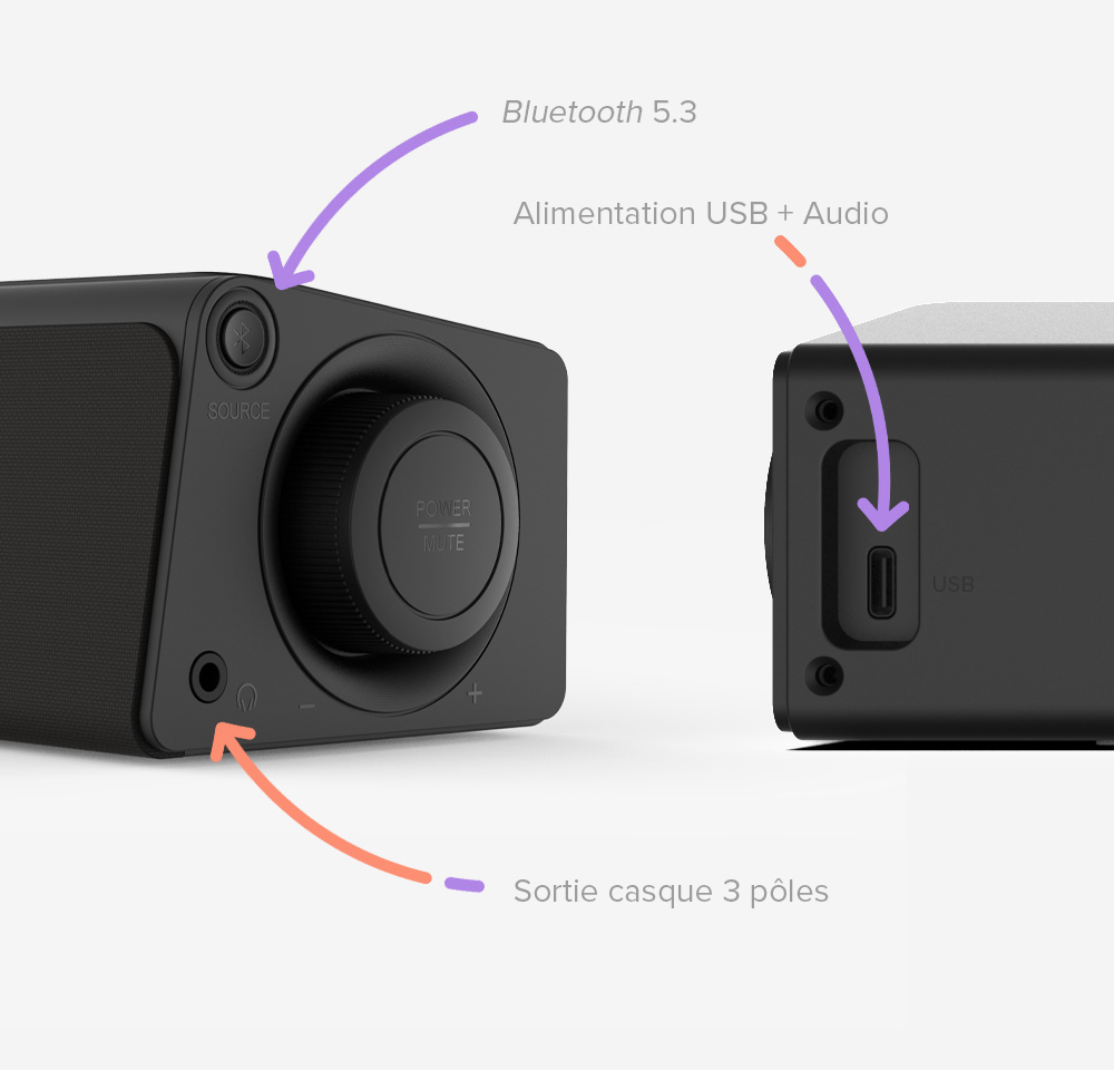 La Creative Stage SE mini est alimentée par USB-C et prend en charge Bluetooth 5.3. Il suffit de connecter la barre de son à un appareil pris en charge pour y accéder !
